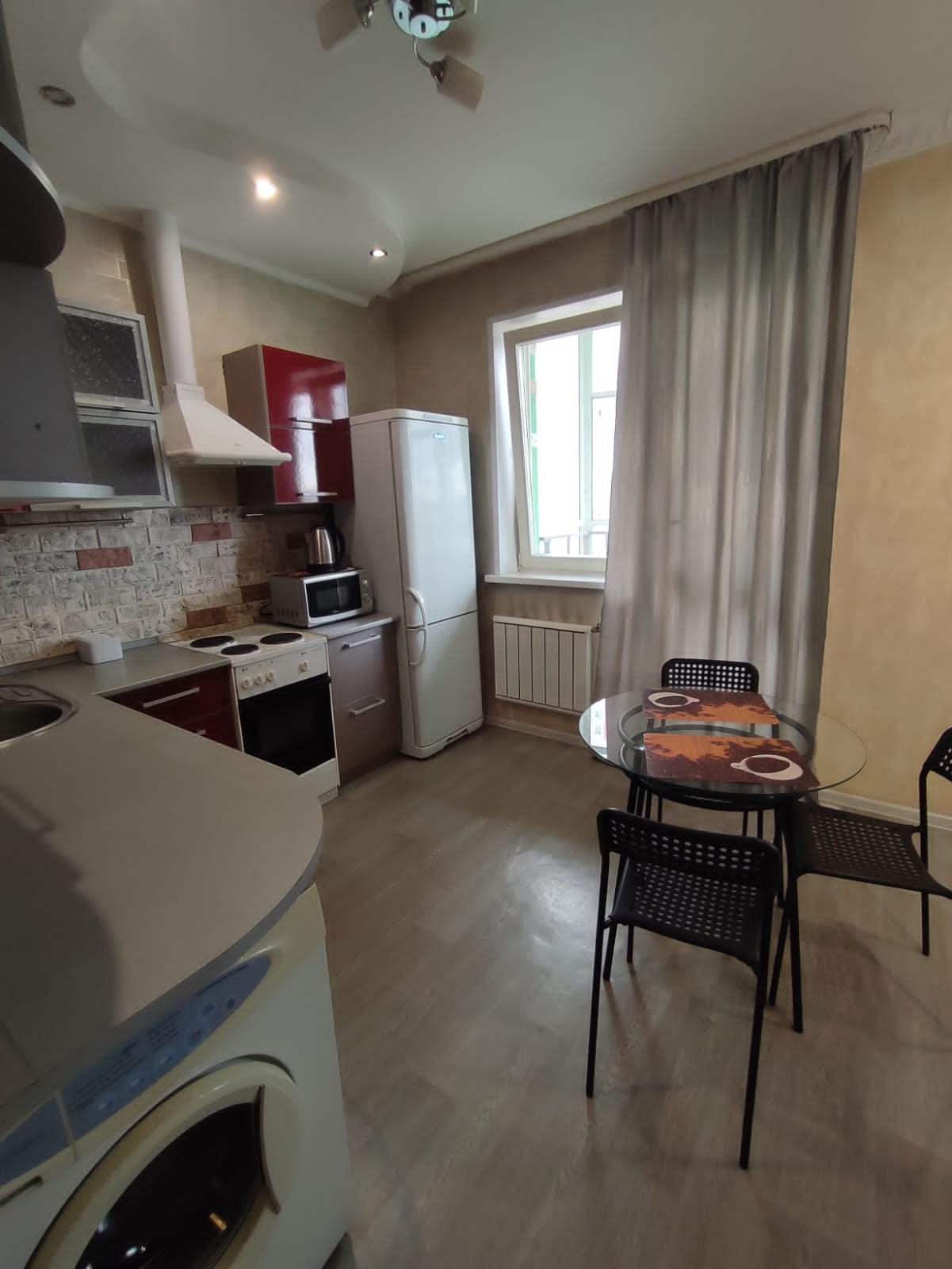 В кухне компактный гарнитур, холодильник, эл.плита, микроволновка, электрочайник, посуда и кухонные приборы на 4 персоны.