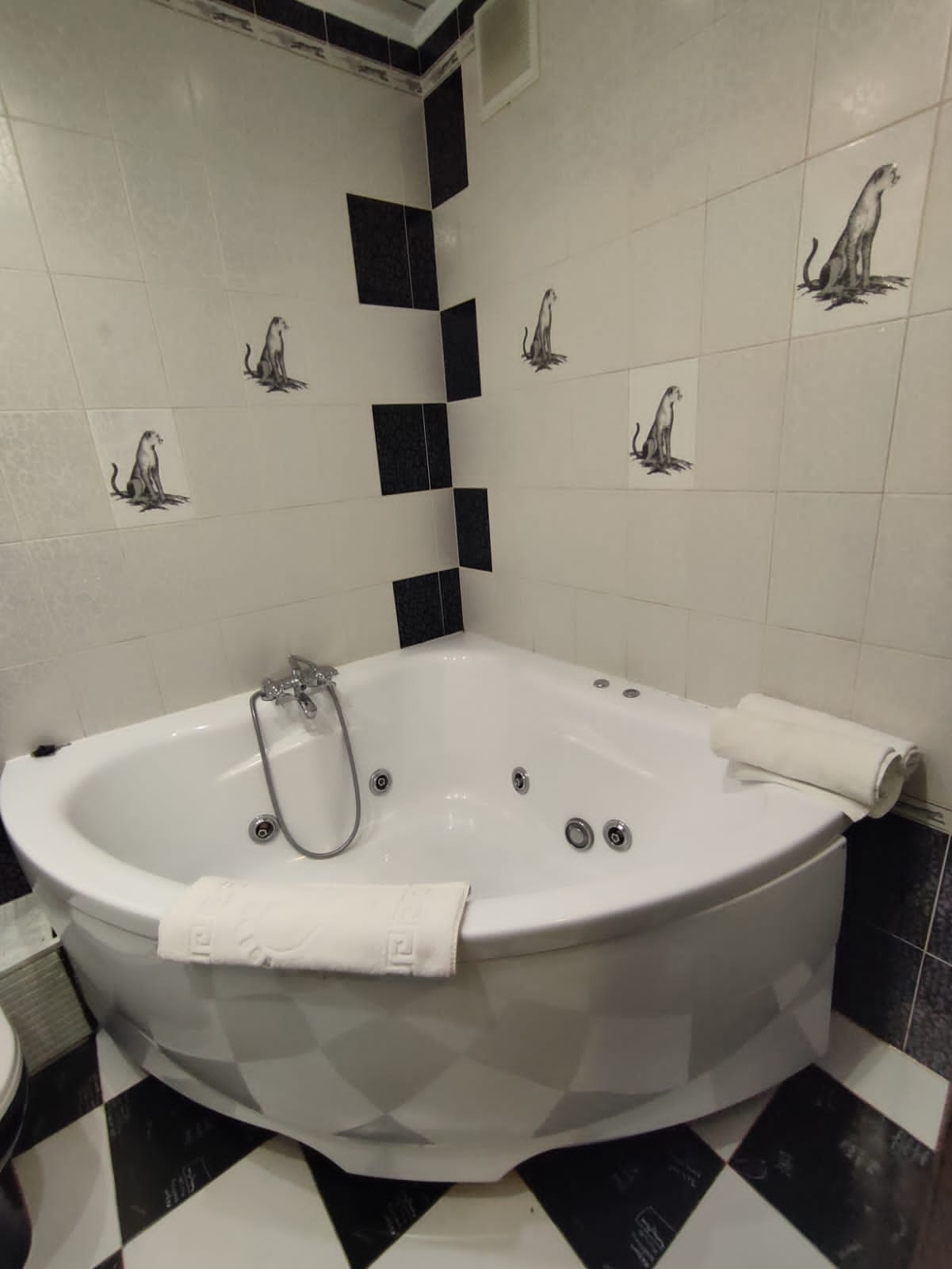 В ванной комнате джакузи, мягкие махровые полотенца, коврик для ног и комплект одноразовой косметики Hotel, фен.